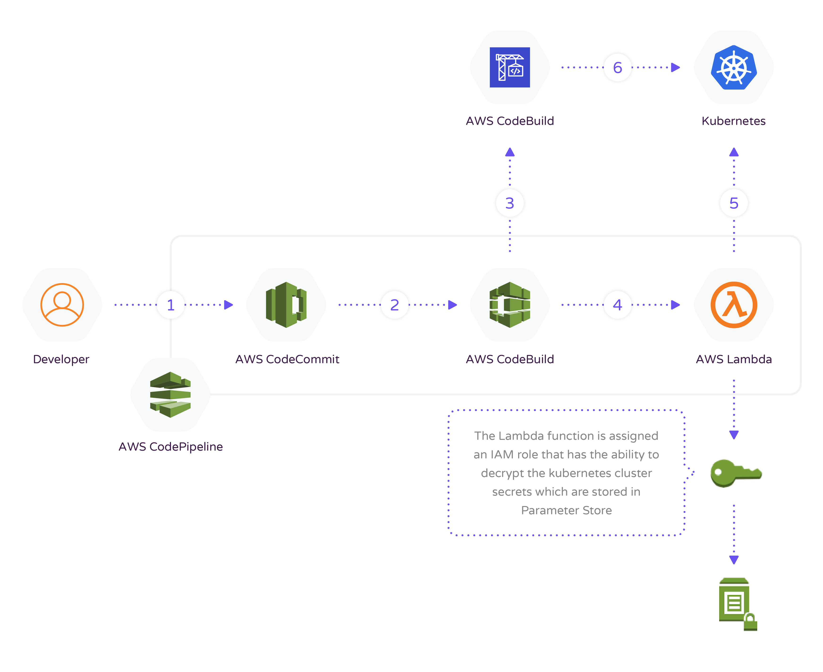 Practicamos la entrega continua mediante AWS CodePipeline, lo que te permite armar un flujo de trabajo que crea código en AWS CodeBuild, ejecuta pruebas automatizadas e implementa código.